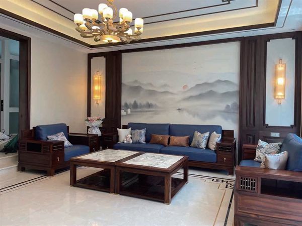 在现代新中式客厅中,常以深木色、米灰色为主色调,模块式木质沙发呈对称布局、围合走势,空间层次感与秩序性自然流露传统中式韵味。