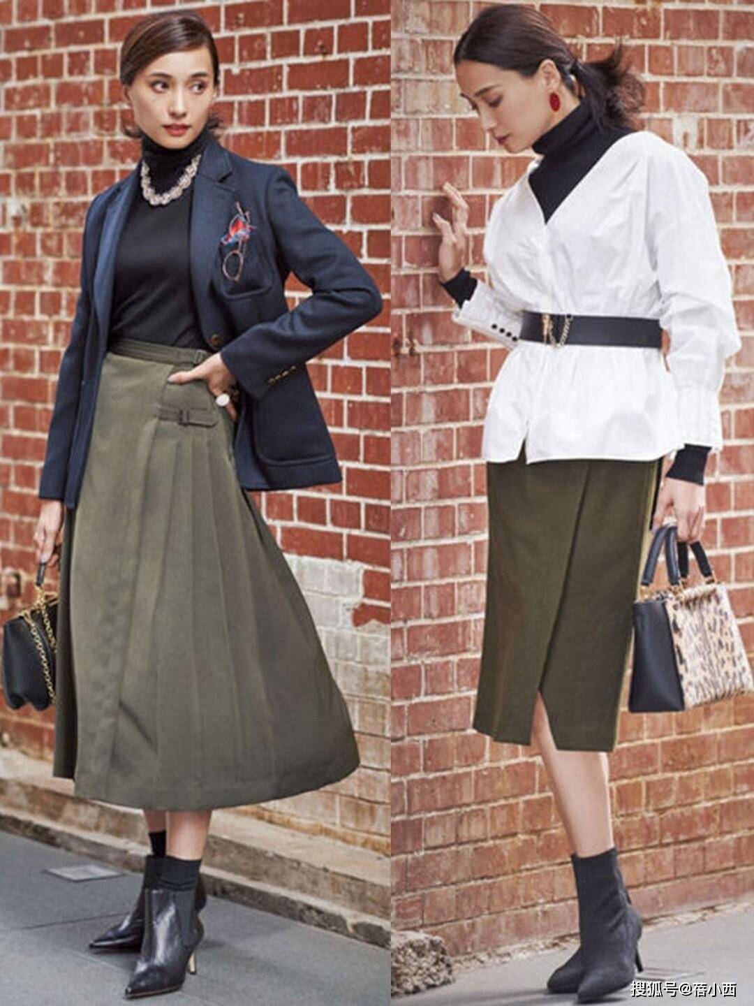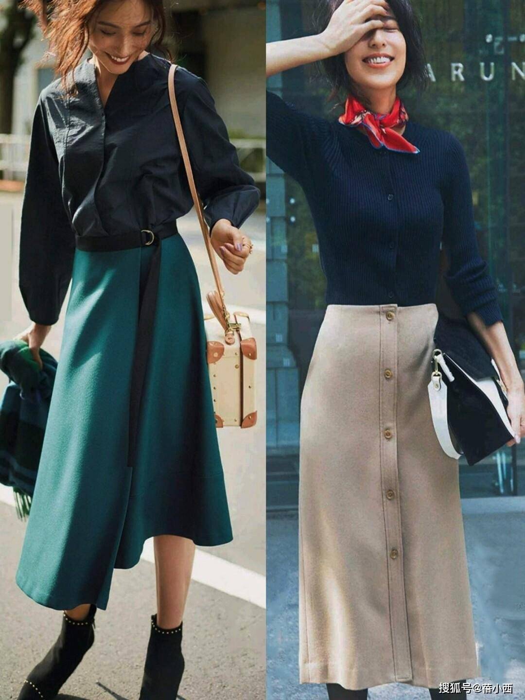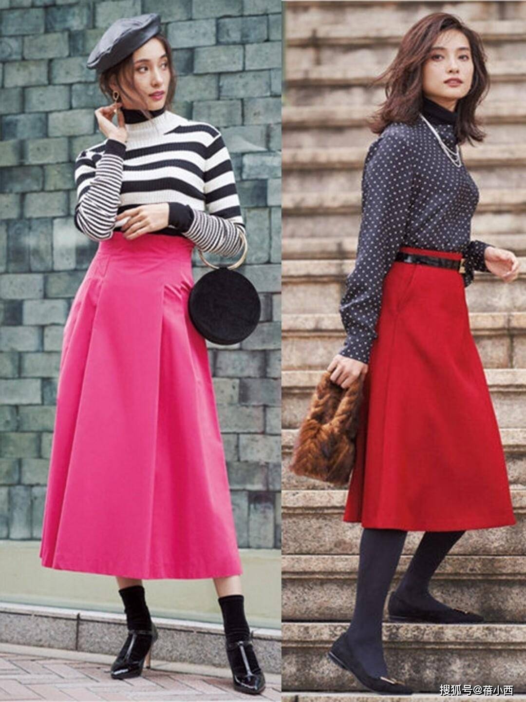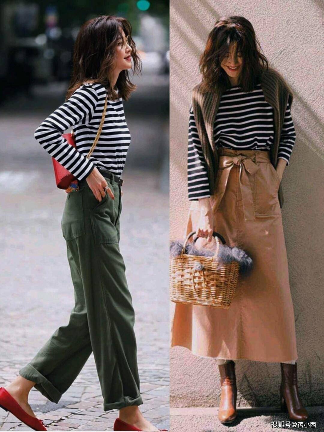 经典的条纹衫无论横竖都很耐看,其中竖条纹尤其适合想要显瘦的女性,能起到拉伸线条的作用。与此同时,彩色半裙也是减龄利器,能让整体穿搭更有活力,避免沉闷。挑选长度时,中长款半裙尤为合适,既能修饰大腿线条,又能通过小腿和鞋履的搭配达到显高显瘦的效果。
