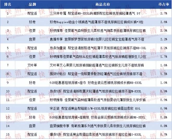 帮宝适、好奇、佳婴分列一二三——婴幼儿纸尿裤热销单品分析2024年中期抖音热销单品榜——婴幼儿纸尿裤TOP15
