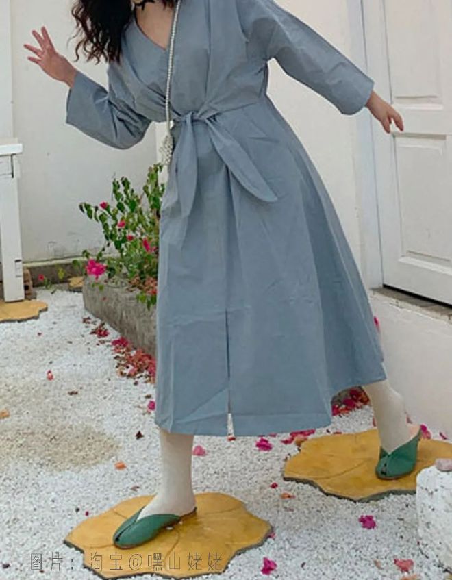 这条裙子妥妥的显瘦王者!棉麻的料子有点硬硬的,本身就很有形状,可以修饰身形。裙摆、肩宽做得够大,大v领、腰部系带又都是显瘦利器,微胖女生都试试看呀!!!
